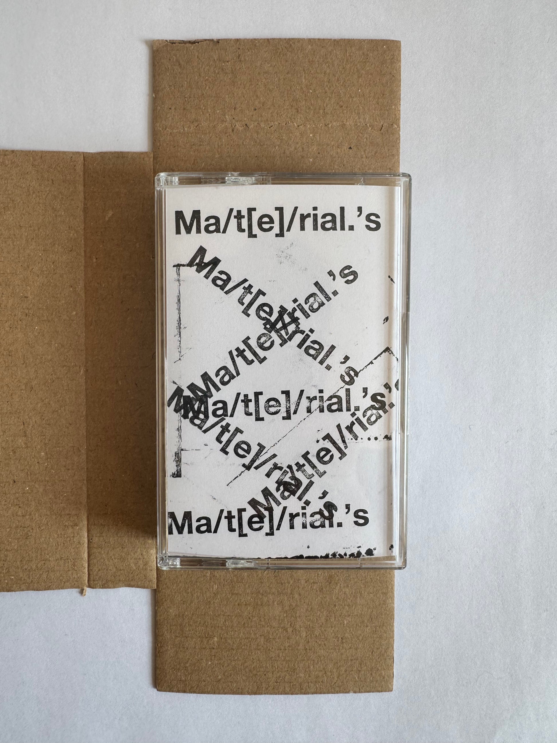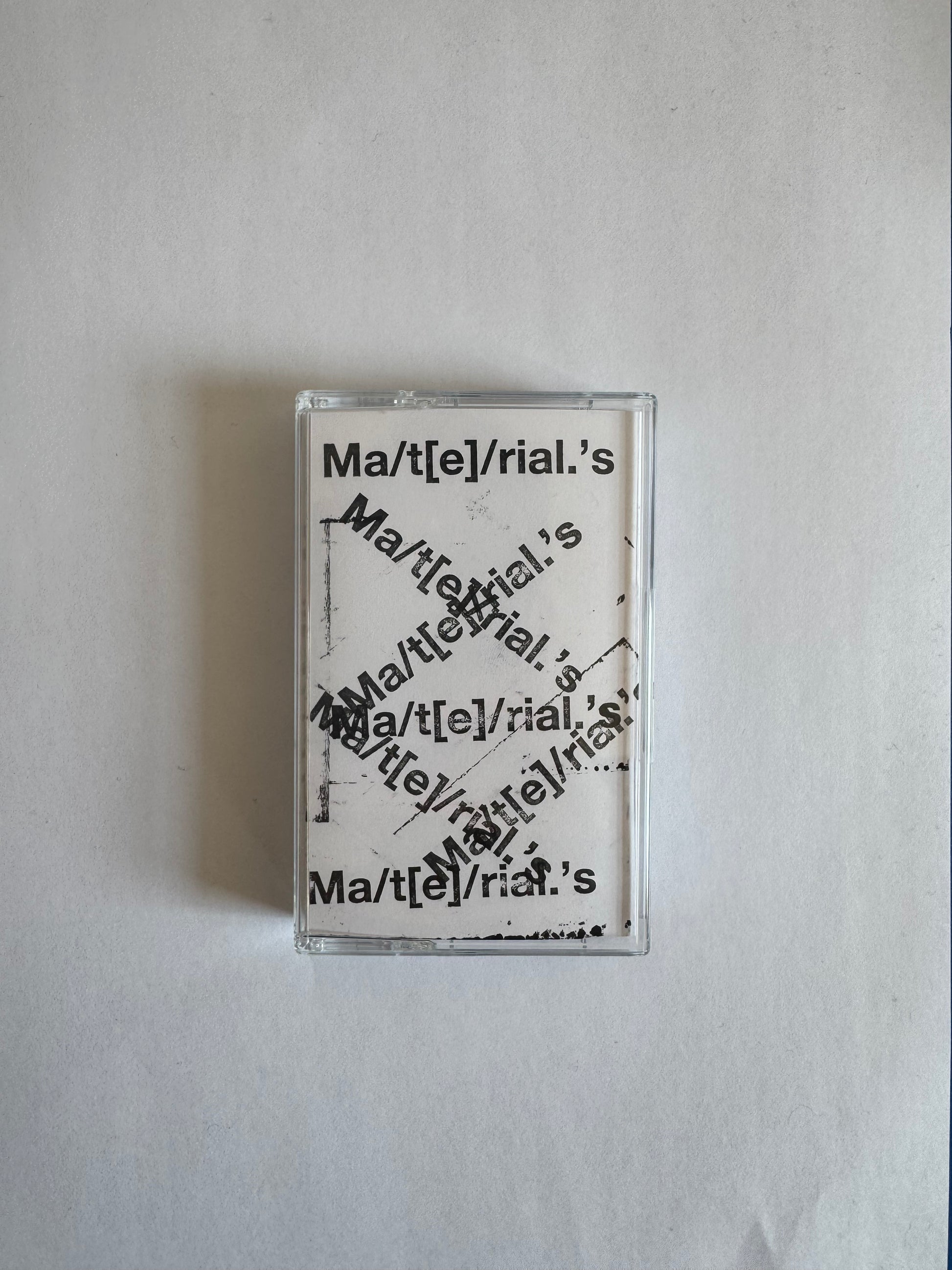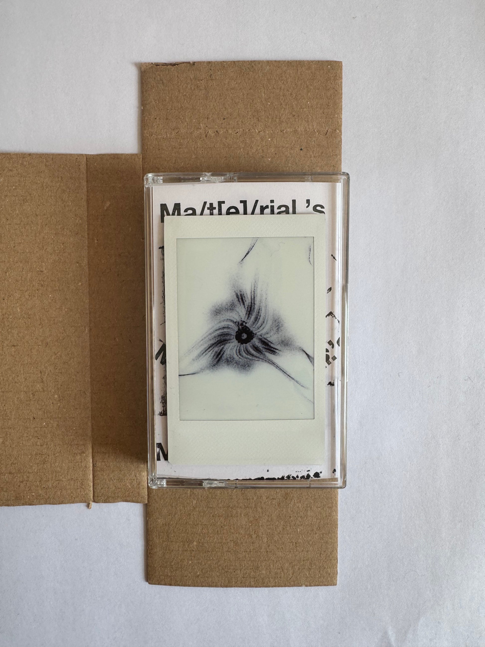Clear-shell, black-hub cassette copy of Ma/t[e]/rial.’s. Each cassette comes hand stamped, with a one-of-a-kind mini-polaroid art print insert.